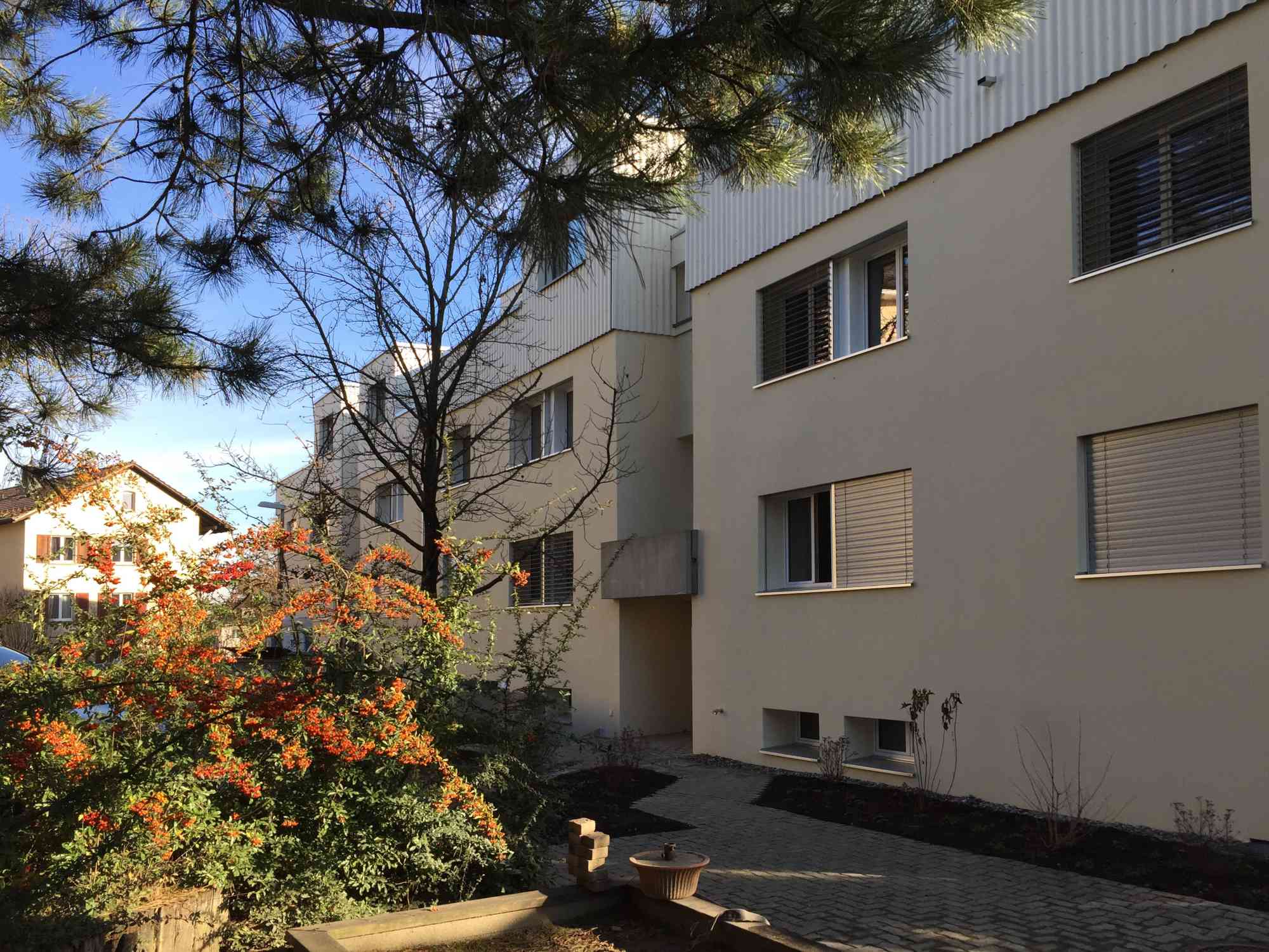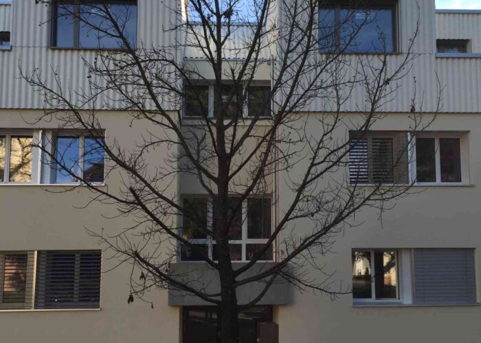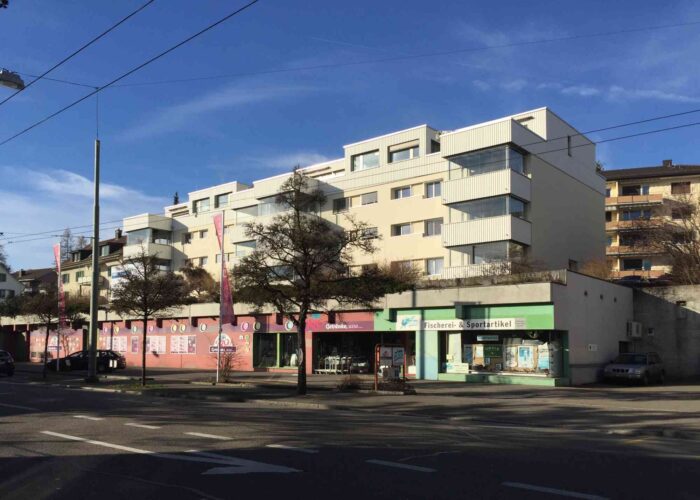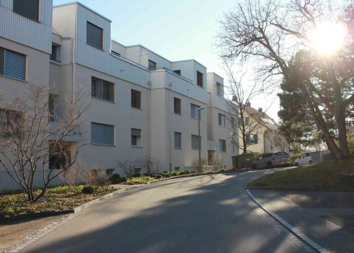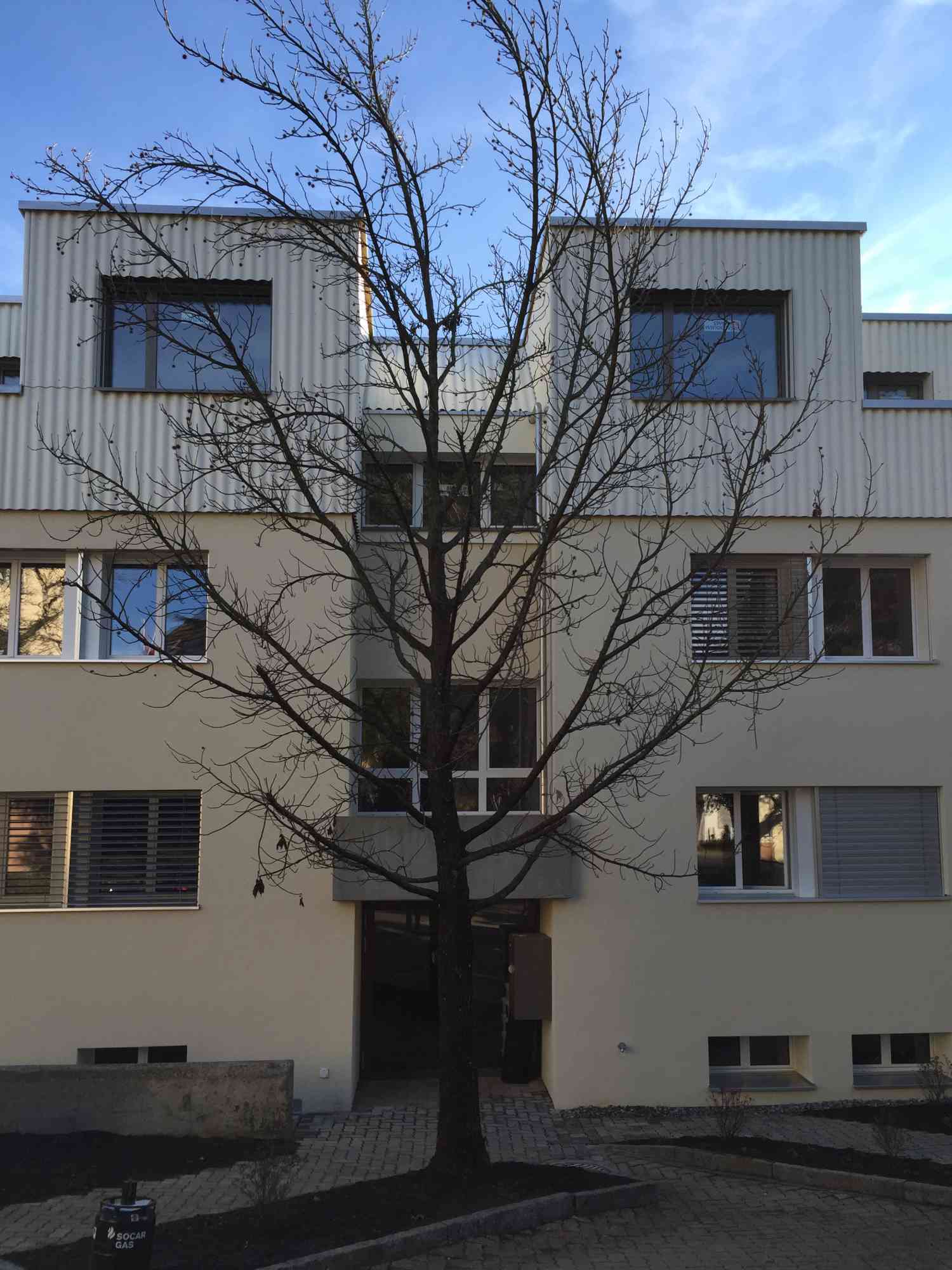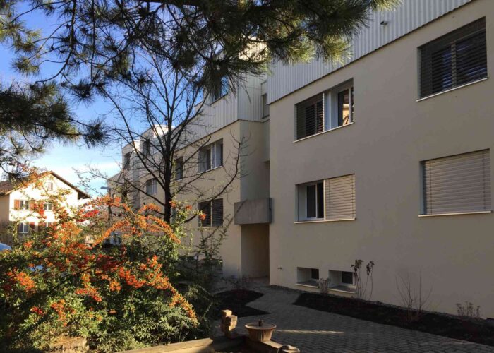 Sanierung von zwei Mehrfamilienhäusern, Aufstockung mit Holzelementen. Dadurch konnten 4 neue Attikawohnungen erstellt werden. Das Dach wurde mit einer PV-Anlage ausgerüstet.